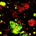 アルツハイマー病の脳にはアミロイド物質が蓄積し、発症の原因となると考えられています。脳アミロイドの主成分はβタンパクですが、これ以外にもアミロイドに固くくっつき、βタンパクの蓄積やアルツハイマー病の発症に影響を与えるタンパク質の存在が想定されてきました。今回我々は、アルツハイマー病の脳にたまったアミロイドから新規の成CLACを同定しました。CLACはコラーゲン状の構造をもち、膜を貫通する形のCLAC前駆体タンパク(25型コラーゲンとも命名されました)から、furinという切断酵素で切り出され、分泌されることも突き止めました。コラーゲンは通常皮膚や血管などの結合組織に大量に存在する線維性のタンパクですが、神経細胞がコラーゲンを作っているということもはじめて分かった事実です。CLACタンパクはβアミロイドに付着することにより、βアミロイドの凝集に影響を与えたり、周囲からの分解に対し抵抗性を与え、アルツハイマー病の発症に影響 を与える可能性が考えられます。このタンパクの存在は1997年にペンシルベニア大のトロジャノフスキー、リー教授らにより予想されていました (Science 277: 31-32, 1997)が、数年にわたる研究の結果、今回我々の研究チームがその同定に成功しました。アミロイド蓄積阻害治療、発症前診断への応用も期待されます。図は抗CLAC抗体9D2と抗βアミロイド抗体で二重染色したアルツハイマー病の脳組織。CLACとβアミロイドが共存する老人斑は黄色に染色されています。